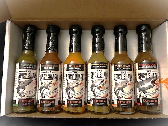 Our favorite HOT SAUCE! (And these are REALLY hot!) Donated by "The Spicy Shark" in New Hampshire, sales from their Hot Sauces support Shark Conservation. (Plus, each Sauce is named after a Shark, with "Fin Levels" to designate the level of HOTNESS.... which we think is an awesome thing!) This item is the "Spicy Shark GIFT BOX" (which retails online for $60). The box (with a cutout Shark on the cover) contains their SIX (6) most popular flavors, in 5 oz glass bottles. These include "Original" (Habanero), "Thresher Shark" (Chipolte), "Nurse Shark" (Jalapeno), "Caribbean Reef Shark" (Scotch Bonnet), "Tiger Shark" (Ghost Pepper), and "MEGALODON" (Carolina Reaper). Item can be shipped nationwide to Winning Bidder (with insurance) or picked up for FREE in Enfield, CT after the Auction. To learn more about this amazing Company (and the good work they do for Shark Conservation), visit their website at www.thespicyshark.com.