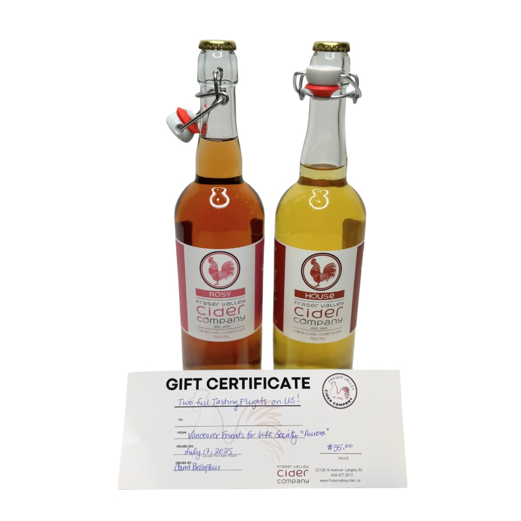 Enjoy the best that local tree fruit has to offer, with two bottles of cider from the famous Fraser Valley Cider Company. You'll enjoy a bottle of their house and rosy ciders, along with a complimentary tasting for two!