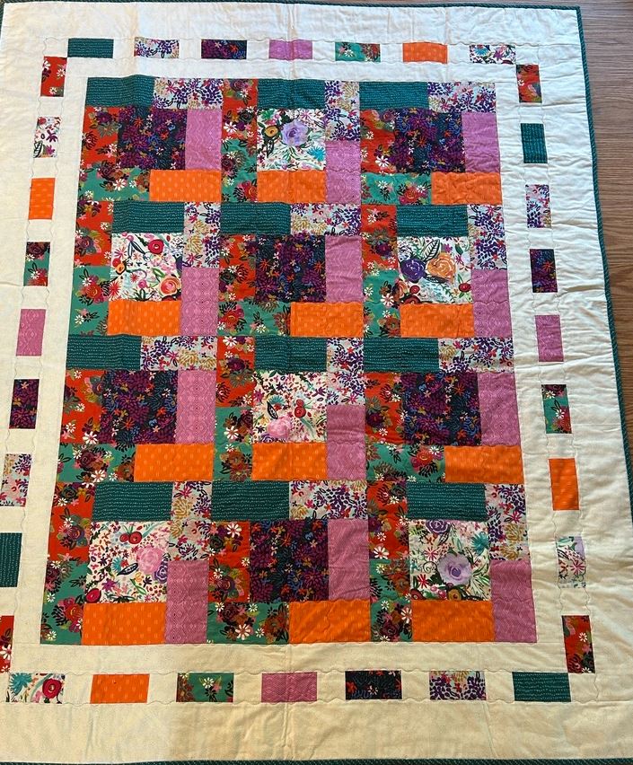 This vibrant, handcrafted quilt bursts with color and charm. With lively floral prints, pops of orange and pink, and bold teal accents, it brings the joy of a blooming garden indoors. Framed by a beautifully pieced border and backed in soft teal fabric, this quilt makes a cozy and eye-catching accent for any home.