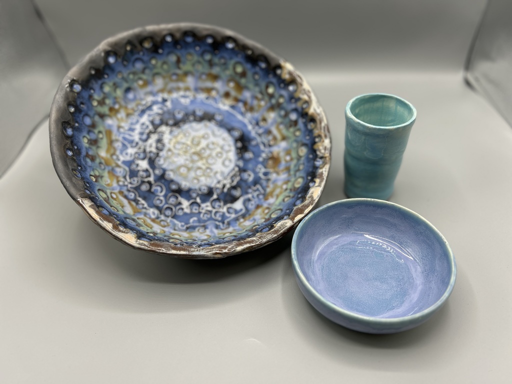 One large hand-glazed bowl (multi-toned: blue, green, brown, white) One lavender ceramic side bowl One tall turquoise ceramic tumbler