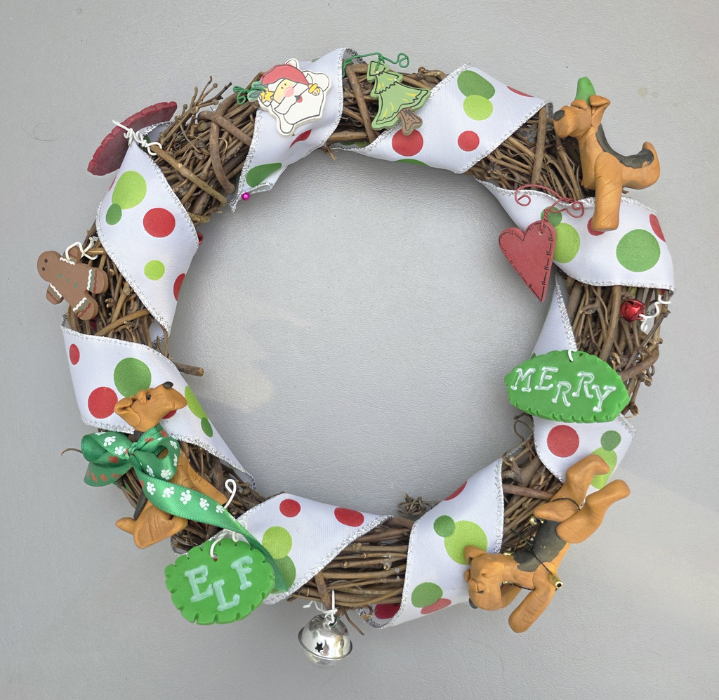 Grape vine wreath wrapped in Christmas ribbon with clay Airedales, jngle bell and other clay Christmas trinkets attached.  One Airedale is missing some legs.  Wreath is 10" in diameter.