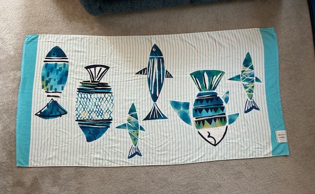 Beautiful Fun Colors (and new with tags). Awesome "Fish Towel". BIG SIZE, to wrap yourself up - at the Beach, Boat, Picnics, or Pool. 100% Cotton. Oversized wrap-around style (it's 72" wide x 36" high). Towel has a Reversible Design, with light colored same-pattern on white - in aquatic blue, aqua, and turquoise colors. Easy laundry care: this "Fish Towel" is machine-washable and can be placed into the Dryer. Available for shipping nationwide. Item can be picked up for FREE by Winning Bidder in Enfield, CT - or Bidder may pay for standard shipping (with insurance). Our favorite design!