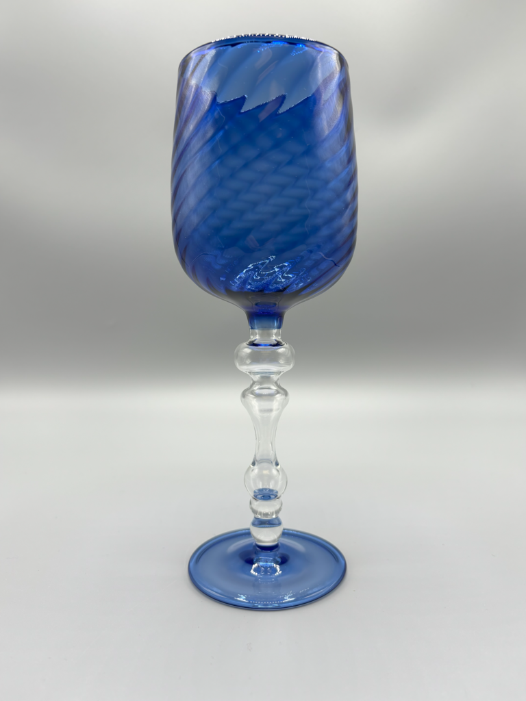 This elegant goblet is a masterful example of Tim Drier?s signature style - clean, refined, and full of character. Featuring a deep cobalt blue bowl with a soft spiral pattern and a sculpted clear glass stem, this hand-blown glass is equally suited for fine wine or artful display.
