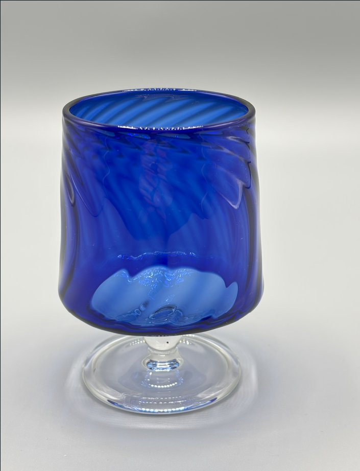 Crafted by Michigan glass artist Tim Drier, this hand-blown pedestal glass features rich cobalt tones and a smooth swirl pattern that captures the light with every angle. The short, rounded bowl sits atop a clear, polished pedestal base, making this piece both sturdy and striking.