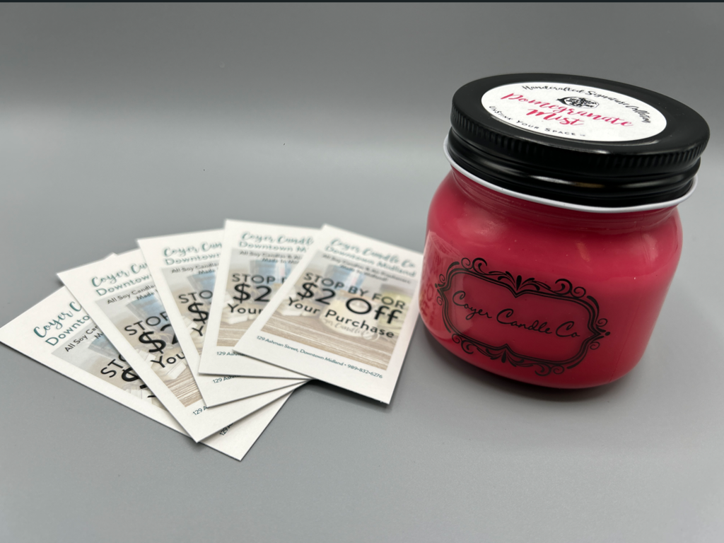 Treat your senses to the rich, fruity aroma of Pomegranate Mist with this hand-poured soy candle from Coyer Candle Co., a local favorite in Downtown Midland. This cozy bundle also includes five $2-off coupons so you can come back and try even more scents!
