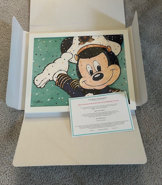 Limited Edition, with Certificate and Original Box. This Commemorative Gift was available ONLY to Disney "Castaway Club Members" - and only during Disney's 25th "Silver Anniversary", cruising on the Disney Cruise Line in 2023. (Limited items, ran out quickly.) This print shows "Captain Mickey" celebrating 25 years. It was created by Disney Artis Joe Kaminski and includes the original box and certificate. It is an 11x14 framed print. Item can be shipped nationwide to Winning Bidder (with insurance) or picked up for FREE in Enfield, CT after the Auction.