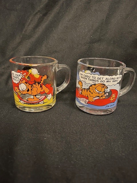 1978 Vintage - New (Never used). TWO McDonald's Original Employee Promo - Glass Mugs for Drinks, Coffee - made by Anchor Hocking Glass Company and given to McDonald's Employees. Adorable clear glass with vinyl designs of Garfield on the front (and Odie on the back), with the sayings "I'm easy to get along with when things go my way" and "Use your friends wisely"). Has the 1978 Copyright and McDonalds Logo on the back. Used as part of a Promotional Campaign by McDonalds in 1978, very collectible. The mugs are 3.5" tall and 3" in diameter. Available for shipping nationwide (with insurance) or Winning Bidder can pick up for FREE in Enfield, Connecticut.