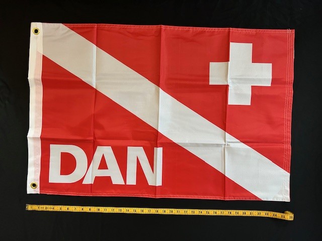 Essential gear for Divers, to stay safe and visible underwater. High quality "Scuba Diver Below" Nylon Dive Flag (donated by DAN Dive Services). Perfect for marking dive locations and ensuring compliance with local safety regulations. Designed for durability and ease of use, the EXTRA-LARGE SIZE DIVE FLAG (36" x 23") is easily seen by passing boats and Dive Buddies. (High visibility colors: red with a diagonal white stripe - and with the DAN logo on both identical sides.) Save money: if purchased online, this DAN Dive Flag would be $50. Slip-in design with 2 grommets and will slide into most standard flag mounts. Available for shipping nationwide: Winning Bidder may pick up item for FREE in Enfield, CT - or pay for standard shipping with insurance.