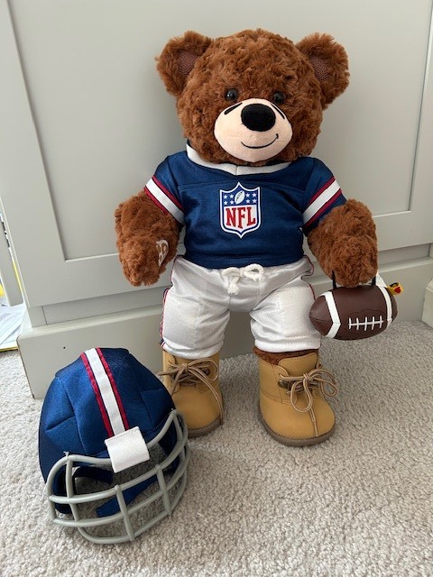 Cutest FOOTBALL FAN: suited up and ready for the Big Game! Authentic "Build-A-Bear" Teddy - specially created for any FOOTBALL FAN (and includes all the EXTRA BONUS Accessories). (Buy now and save for Holidays or Super Bowl - this is an amazing Price!) Limited Edition "Football Bear": Teddy has soft brown fur, a leather-like Football Print on his bottom feet - and even the sporty "Eye Black" streaks under each eye. Extra Tall Bear (18 inches high) with all authentic Build-A-Bear Tags. His EXTRA "Sports Accessories" are also included: Teddy is wearing an authentic NFL Football Jersey, White Sports Pants, Football Helmet, Boots, and even has a Football. (And we'll include some additional Costumes for him, too - to get ready for Halloween.) If Accessories were purchased seperately (directly from Build-A-Bear, they would be over $100 in Value (plus cost of Bear and extra costumez)., Fun Item - and just donated to our Auction on the Last Day (so choose him before anyone else sees it in our catalog!) Football Teddy and Accessories can be shipped nationwide to Winning Bidder (with insurance) or picked up for FREE after Auction in Enfield, CT. Perfect Gift for a Foorball Fan!