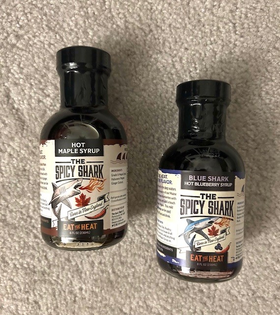 Hottest HOT SYRUP! TWO new Flavors from "The Spicy Shark" - includes TWO (2) Glass Bottles (8 oz each) of their newest HOT Syrups: "Hot Maple Syrup" and "Hot Blueberry Syrup". Blueberry has a "1-Fin, Mild" Rating while Maple has a "3-Fin Moderate" Hotness Rating. All "Spicy Shark" Products benefit Shark Conservation Nonprofits. Great way to wake up in the morning, on pancakes or waffles. Item can be shipped nationwide to Winning Bidder (with insurance) or picked up for FREE in Enfield, CT after the Auction. We love this Company! (Note: There are additional Hot Sauce Products )(and also "Spicy Shark" T-Shirts, Hats, and "Hot Sauce HOLSTER") being offered in this Auction, too). Makes a perfect Gift!
