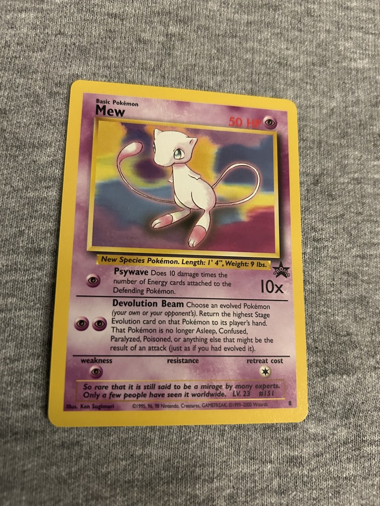 Mint condition, never played, original Owner. This card is 25 years old. "Mew Promo Card" (Black Star #8) was provided exclusively to Retail Game Store Owners in 2000 to use for in-Store Promotional Special Events (and released by Wizard for "The Pokemon League"). It is a rare vintage Pokemon with the Character "Mew", 50 HP, and the skill of "Psywave". It is available to the Winning Bidder for shipping nationwide (with insurance) - or may be picked up for FREE in Enfield, Connecticut after the Auction.