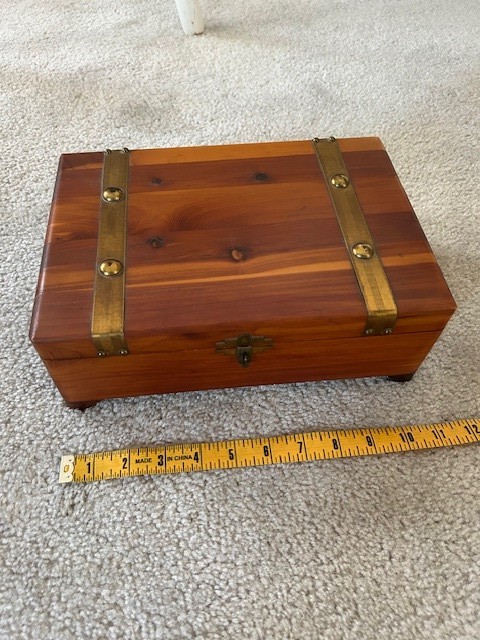 Vintage 1940/1950 gorgeous CEDAR WOOD "Collector's Trinket / Jewelry / Treasure Box". Handmade in Ohio by Pilliod-Swanton Company during 1940's and 1950's. Box is in immaculate condition (and 75 years old). Rectangular mini Treasure Chest with brass lock-clip, designs, and 4 stool feet. Box measures 11" long, 7.5" high, and 4" deep. Pilliod was founded in 1902 and made Machinists's Chests and Cabinets through World War II. Beautiful, well-crafted, and sturdy. Item can be shipped nationwide to Winning Bidder (with insurance) or picked up for FREE in Enfield, CT after Auction.