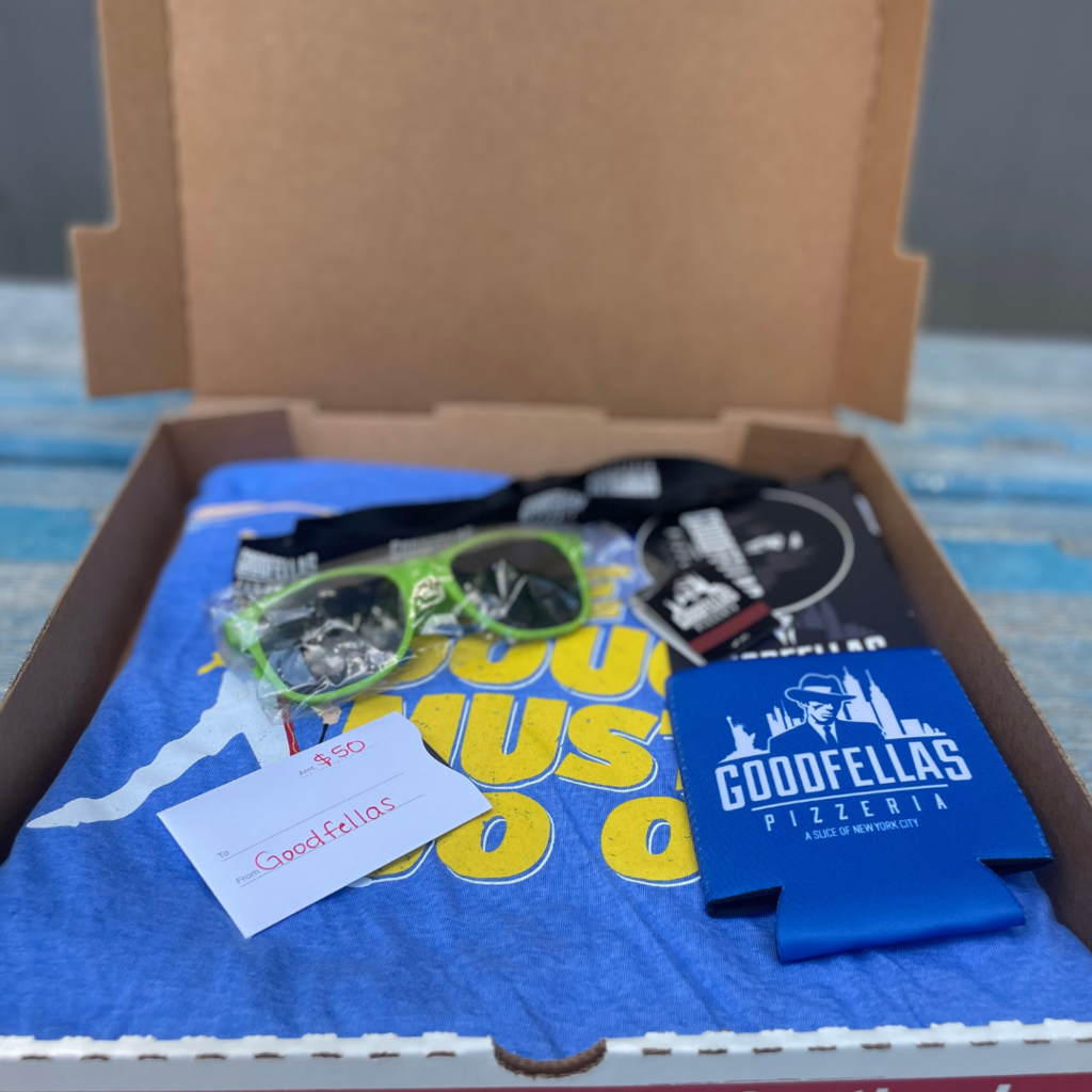 Basket includes $50 gift card good at Goodfellas, with t-shirt (size Large) and misc branded items