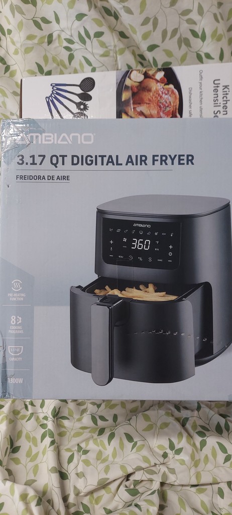 This air fryer has 8 different cooking programs, a dishwasher safe fry basket, pre-heat and keep warm functions and an easy-to-clean touch control panel. 1300W. 6 pc. kitchen utensil set included