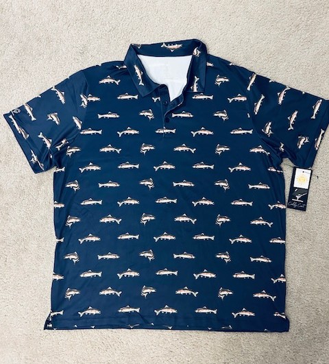 Best Gift: Fun FISH Pattern - in a classy shirt! (Plus, it's a "SUN-SHIRT" with UPF-50 Protection. Brand new with tags. This is size "Adult, MEDIUM". Moisture-wicking, 4-way stretch, breathable fabric. (Note: There are additional similar shirts in this Auction, under the "Fitness", "Travel", and "Clothing" Categories - and you can get the same style in different sizes - to have MATCHING SHIRTS, with family and friends!) This shirt is Navy Blue, Comfort-stretch, Short sleeve - in a 3-button "Collared Style" - perfect for Beach, Boat, Summer Nights, or Golf Course. Lightweight, with a fun Fish Pattern. Loose fit: 95% Polyester, 5% Spandex. Item can be shipped nationwide to Winning Bidder (with insurance) or picked up for FREE in Enfield, CT after the Auction. Stylish, unique, and fun!