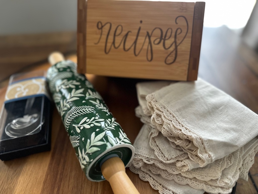This beautiful collection is perfect for creating a warm and welcoming Thanksgiving feast. It includes everything you need to create your own culinary masterpieces with love and grace. The focal point of the set is the four beautiful cloth placemats, which are the perfect backdrop for a festive Thanksgiving dinner. The set also includes a beautiful rolling pin with a festive fall design - imagine the pies, breads or cookies that could be made with that lovely design.  You'll also receive heart-shaped measuring spoons to add a touch of love to all of your baking, and an elegant recipe box is crafted from beautiful bamboo and features the word "recipes" gracefully engraved on the lid in a rich brown script.
