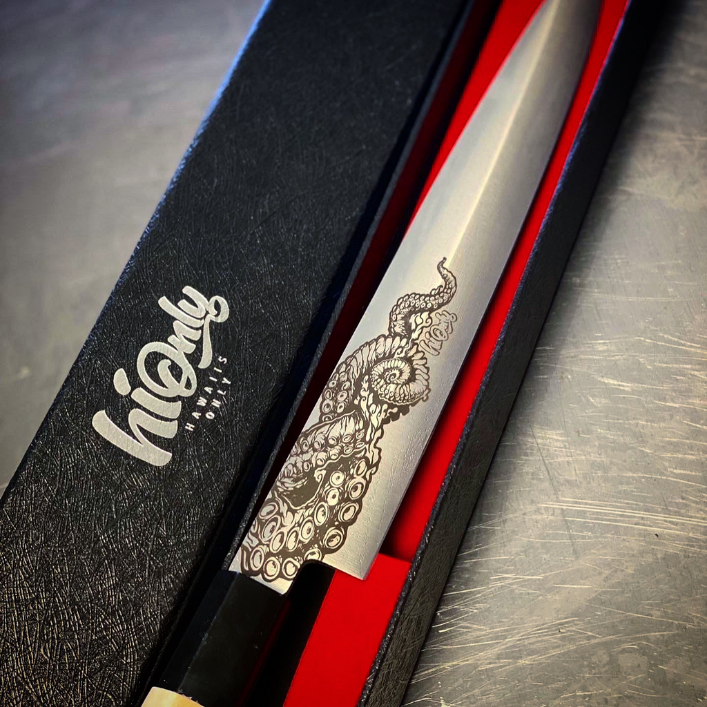 8 inch Chef Knife, VG10 steel, custom handle and gift box. Hawaiian artwork.