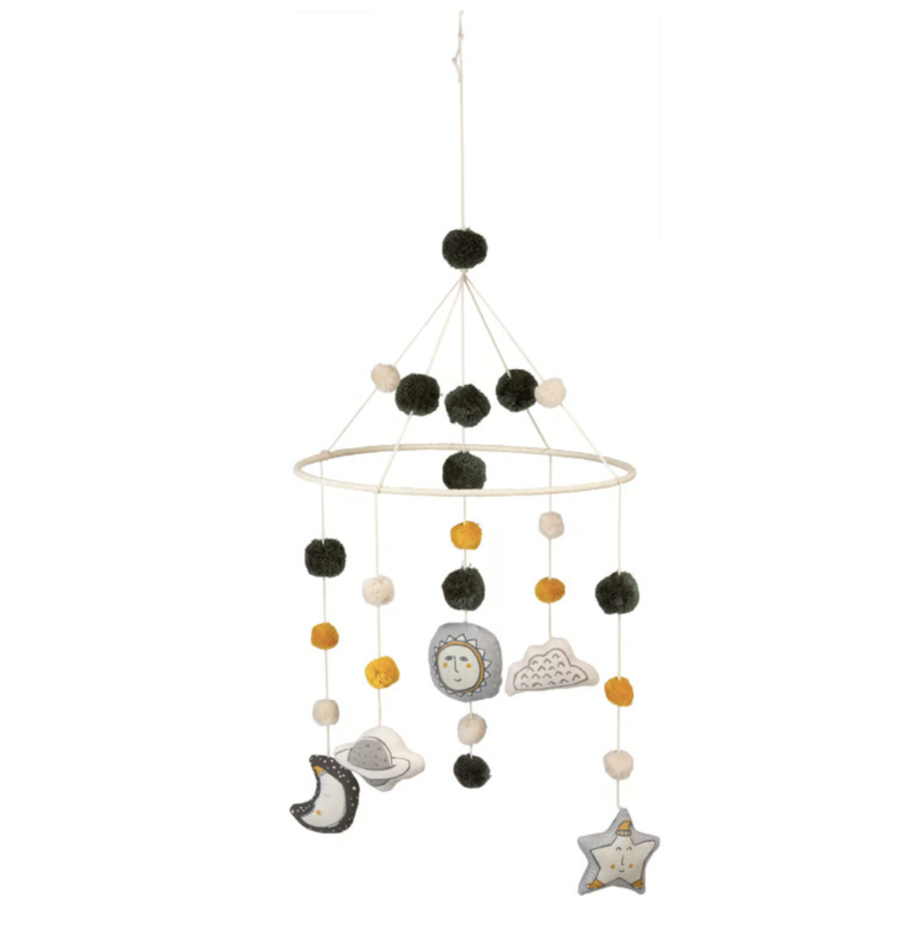 Perfect in a child's room or above a crib, a galaxy-themed mobile in a neutral yellow and gray palette featuring pom details, various sun, star, moon, cloud, and planet designs, and top open ring with loop for easy hanging. A part of our exclusive Happy + Bright Collection. Textiles are phthalate and AZO dye free.