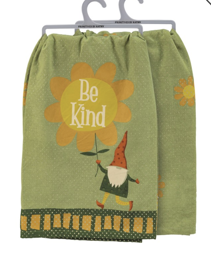 A cotton kitchen towel featuring all-over rustic gnome designs and "Be Kind" sentiment. Machine-washable.