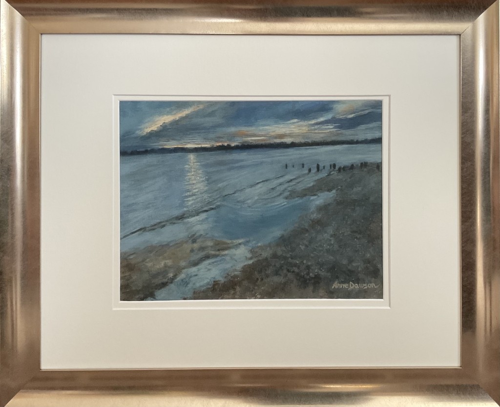 Immerse yourself in the tranquil beauty of "Ebb Tide at Crescent Park Beach", an original acrylic painting by local artist Anne Dawson that captures the serene retreat of the Narragansett Bay. Rich textures and subtle hues evoke the quiet rhythm of the tide and the nostalgic charm of this beloved Riverside shoreline. This one-of-a-kind piece is perfect for collectors seeking coastal elegance and emotional depth.