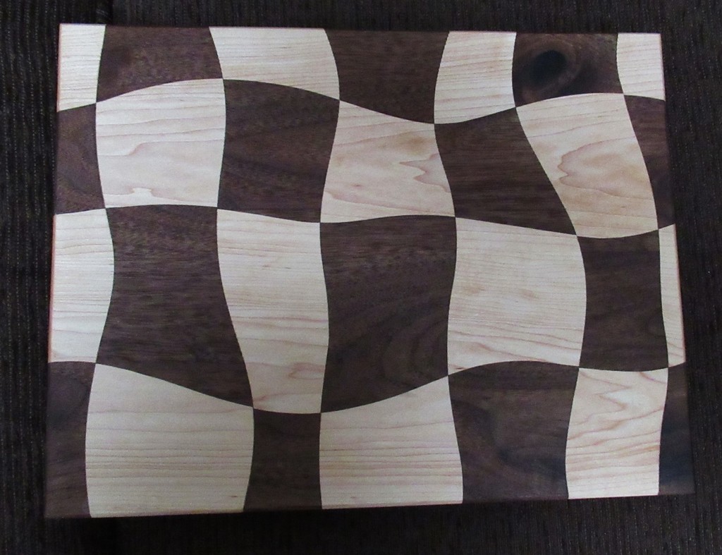 This locally handcrafted wooden cutting board is made from maple and walnut wood and features a pattern of very attractive alternating colors.