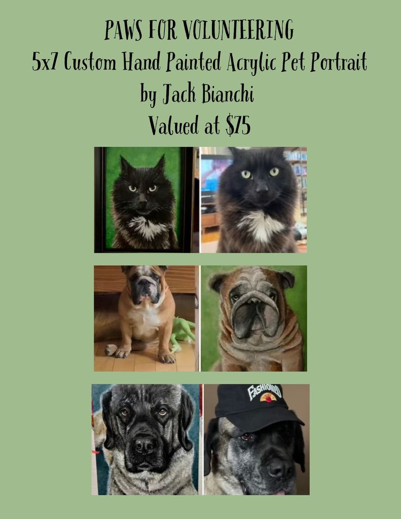Capture your furry friend?s personality in a beautiful keepsake! Simply send a favorite photo to Jack Bianchi of Paws for Volunteering, and he?ll hand-paint a stunning 5"x7" acrylic portrait ? a heartfelt way to celebrate your beloved pet.