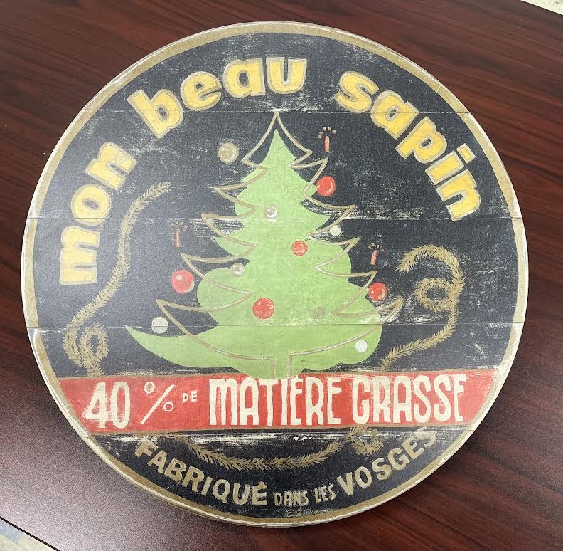 This beautiful giclee of a hand-painted Christmas Tree is on a 1/2" domestic wood round platter. The custom design is inspired by vintage French cheese labels. This lazy susan is fun and whimsical and looks great on a holiday table.