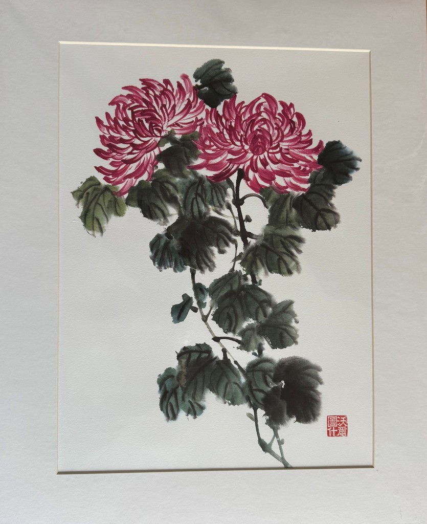 "Chrysanthemums" is a print of an original Vartus Varadian brush and watercolor on rice paper painting, set in a custom 16 x 20 mat.