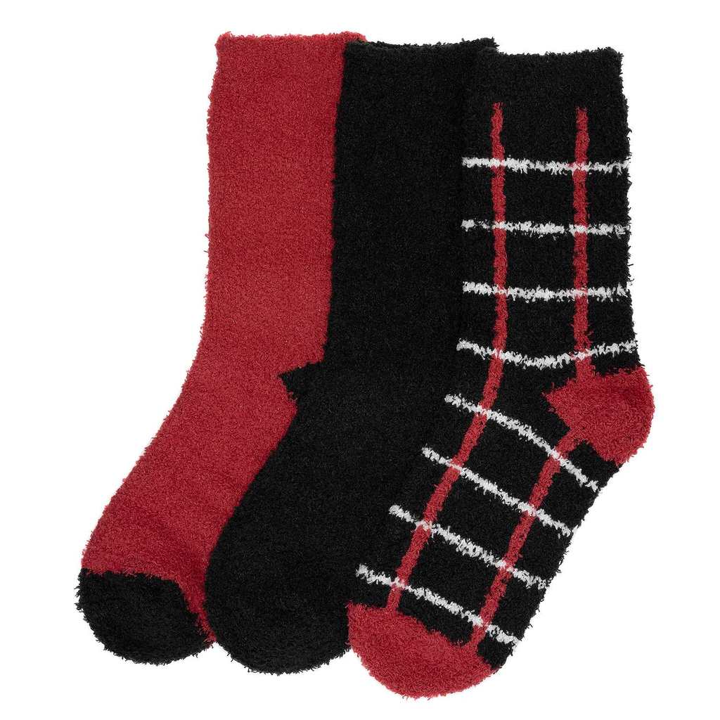 Women's Cuddl Duds 3 Pack Plushfill cozy crew socks. Packed in a holiday box ready for gifting. Black, red and black/red/white plaid. Shoe size 4-10.