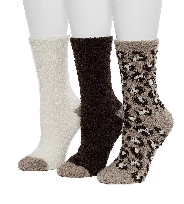 Women's Cuddl Duds 3 Pack Plushfill cozy crew socks. Packed in a holiday box ready for gifting. Leopard print, brown and cream. Shoe size 4-10.