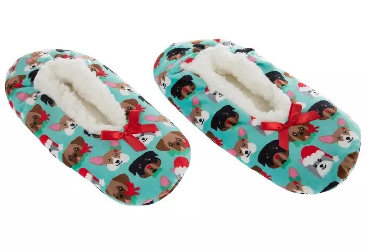 Treat your feet to these comfortable Holiday Dogs Women's Slipper Socks! These comfortable slipper socks are decorated with designs of puppy dogs wearing holiday hats and embellishments. Underneath the socks are grippy dots that will prevent you from slipping. M/L size 8-10 Machine Wash, Cold,