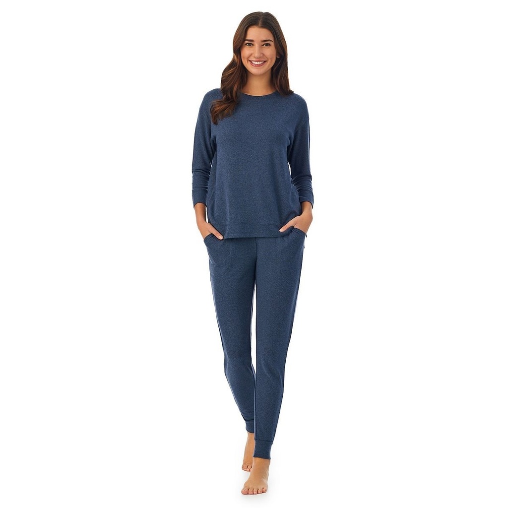You will love cozying up in this sweater knit pajama set by Cuddl Duds. Features 3/4-length sleeves; pants with banded hems, elastic waistband and side pockets. 95 percent polyester; 5 percent spandex. Heather blue. Runs large. Tagged medium - top measures 24 inches under arms