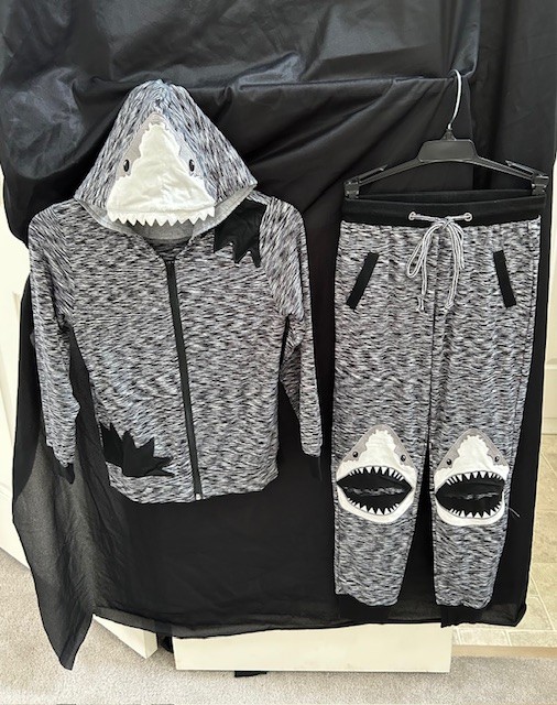 Super Cute Item!!!! We're offering this is in several different sizes - so buy adorable "MATCHING Shark Outfits" for Family and Friends! This is a 2-piece Outfit, in Size "Youth Extra Large" (equivalent to "Adult Small/Medium"). (See photo for sizing.) It's made of a soft "sweatshirt material" (so could be worn as regular comfy clothes). The 2-piecee set includes 1 black-and-white Hooded Sweatshirt (with a zipper and "Shark Hood") + 1 Pair Sweatpants (elastic waistband with a tie) - to become an adorable SHARK - any time of year. Super comfortable. 91% Cotton, 9% Spandex. (To assist with Comparison Sizing... the person in the Attached Photo is 5"5" (and typically wears clothing that is "Adult Medium"). They are wearing the "Youth Extra Large" Shark Outfit, which is the perfect (and silly!) sized match). Shark Costume may be shipped nationwide to Winning Bidder or picked up for FREE in Enfield, CT. (Perfect for "Shark Week" - or save for next Halloween!)