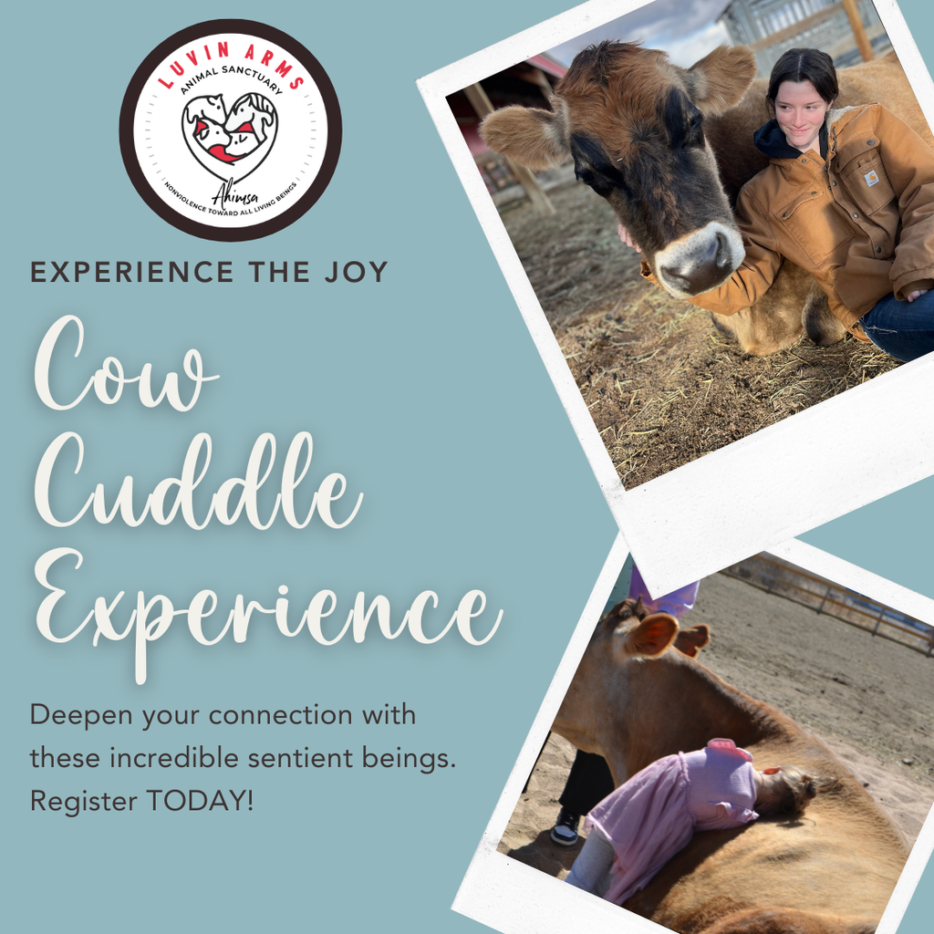 A gift certificate for a Cow Cuddle Experience for two. The Cow Cuddle Experience invites you to spend an hour with the rescued cow residents of Luvin Arms Animal Sanctuary in Erie, Colorado. During this intimate encounter, you'll have the opportunity to meet, cuddle, brush, and scratch these magnificent rescued animals. With their slower heart rate and warmer body temperature, spending time with cows can help slow your own heart rate and release oxytocin, the "cuddle hormone."