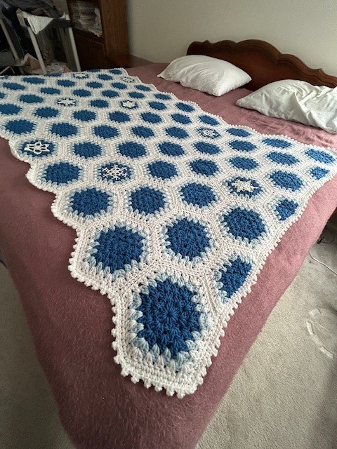 Handmade, gorgeous craftsmanship! Perfect Gift: this is NEW, never used (and donated to H2O Planet for this Charity Auction). Ideal size for a cozy AFGHAN, BLANKET or THROW. Pattern is called ?Granny Hexagon? or ?Flower Hexagon? (related to the repeating geometric motifs). Color Palette has a bright and cheery Royal Blue, Light Blue, and White ? with a REVERSIBLE style on 2 sides. The Bonus: one side is interspersed with 9 intricately handmade CROCHET snowflake/floral centerpieces. Crafter estimated 50+ hours to create this beautiful item. Size is 82? length and 48? width. (In photos, Afghan is pictured lying on a king-sized bed, to help provide Size Estimates.) Well-made and in perfect condition. Item can be shipped nationwide to Winning Bidder (with insurance) or picked up for FREE in Enfield, CT after Auction. Thoughtful gift (for yourself - or your Valentine)!