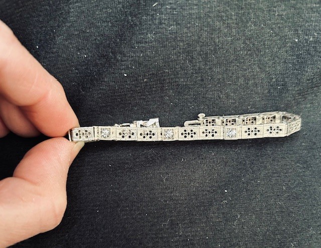Gorgeous! Antique 1920's / 1930's "ART DECO" Bracelet with hinged Filagree Links. Marked "Sterling" on the clasp and has 3 small diamonds on the front. Beautiful intricate geometric design (classic of the 1920's and 1930's) - just donated to H2O Planet from an Estate Sale. The clasp has the classic "hourglass" design. Bracelet is 6" long - and in exquisite condition. Item can be shipped nationwide to Winning Bidder (with insurance) or picked up for FREE in Enfield, CT after the Auction. Lovely gift - or keep for yourself!