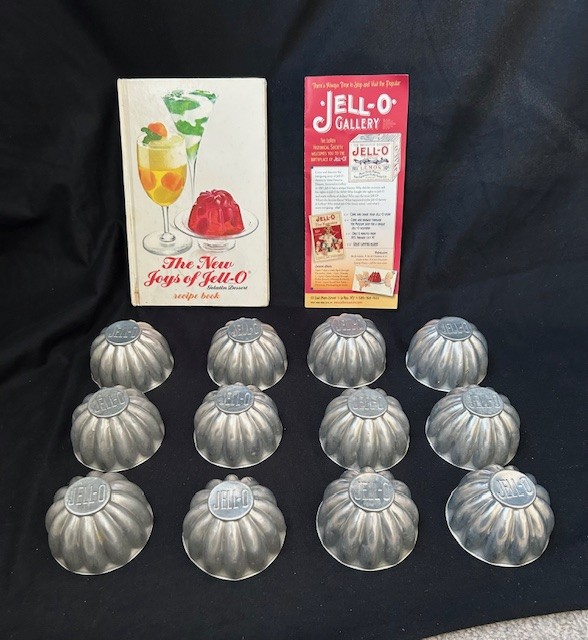 75 years old - fun RETRO Nostalgic Gift! (Remember these..... from Grandma's House?) You'll rarely find a COMPLETE SET, of 12 MOLDS, all together - along with the Collectible 128-page "Jello Recipe Book" (out-of-print since 1975). These Molds were popular from the 1930's to the 1950's. They are a lightweight aluminum fluted mini-molds, with a scalloped pattern (and embossed with the word "JELL-O" on the bottom of each) - used for making individual desserts (like gelatin or bundt cakes). Molds are in excellent condition, 3 inches diameter, and 2 inches high. There are twelve (12) of them. The Hardcover Recipe Book was published in 1975 (and has been out-of-print for 50 years). It contains multiple recipes and color photographs for gelatin-based Salads, Desserts, and other dishes. (Yes, really! 128 pages of Jello Recipes!) Items can be shipped nationwide to Winning Bidder - or picked up for FREE in Enfield, CT after the Auction. Fun RETRO Nostalgia Valentine's or Birthday Gift, for any age.