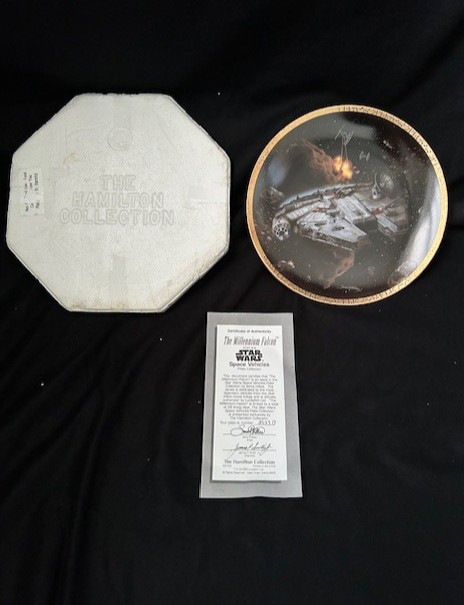 Numbered - and limited-run edition! Made in 1994 (so this is already 30 years old!), by Hamilton Collection. These plates were created for just 28 days (and they have all the original paperwork, boxes, and limited numbered Certificates). This plate shows "STAR WARS - Millennium Falcon" (from "The Empire Strikes Back") - as it escapes through an Asteroid Field while being chased by TIE Fighters. The Plate is numbered "#2637-B" (as shown on the back of the Plate and the accompanying original Certificate). It has NEVER been out of the original box in 30 years (except for this photo). The material is a fine porcelain, trimmed with 23K gold along the edges (and there are NO chips or marks anywhere). It includes the Original Box and Numbered Certificate. Item can be shipped nationwide to Winning Bidder - or picked up for FREE in Enfield, CT. An amazing collectible - for any Sci Fi Fan! (Note: We have 2 similar plates in this current Auction, to buy a matched set for a Gift.)