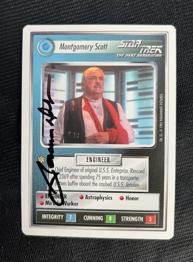 James has signed a RARE PROMOTIONAL CARD. (While easy to find Autographs on generic cast photos, you'll rarely ever find them on specially-created Promotional Items like this Game Card.) This Promo Card was designed for the new 1994 Collectible Card Game "Star Trek Customizable Card Game", created by Decipher Games and based on the Star Trek Universe. (In the 1990's, the game was more popular than "Magic The Gathering" and has been out of print for many years.) This special Promotional Card was created and distributed ONLY to Retail Game Store Owners, and ONLY at the 1995 Gen Con Game Convention in Milwaukee (where James Doohan offered the opening address and signed Autographs for only ONE HOUR (on ONE single day, in 1995).