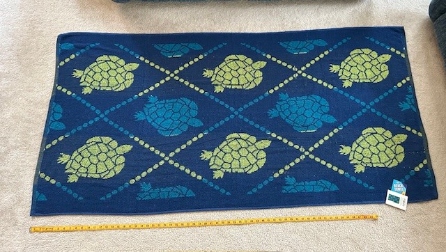 New with tags!  Adorable "Turtle Towel".    BIG SIZE, to wrap yourself up in - at the Beach, Boat, Picnics, or Pool.  Over-sized wrap-around style (it's 72" wide x 36" high).  Towel has a Reversible Design, with 2 color combinations (front and back are reversed-colored, with attractive blue and light-green shades).  Easy laundry care: this "Turtle Towel" is machine-washable and can be placed into the Dryer.  Made of absorbant terrycloth.  Available for shipping nationwide.  Item can be picked up for FREE by Winning Bidder in Enfield, CT - or Bidder may pay for standard shipping (with insurance).  Super cute!