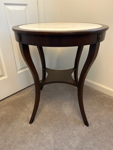Amazing Donation to our Charity! This 1945 "ART DECO Side Table" was used on a Broadway Stage during the 1940's. The table is Mahogany Regency, Parchment Top with Cabriole legs. Made by Robert Irwin (who created high-end furniture from 1919-1953, with the "IRWIN" Tag on the bottom). This small Round Table was used on Broadway for the play "Seven Lively Arts? (which was at the Ziegfield Theater in New York in 1945). Amazing Gift: it's the REAL thing, recently donated to H2O Planet from an ESTATE SALE, with Original Family of Broadway Stage Manager. Table has never been altered or restored (and the combination of Natural Parchment with the rich Mahogany Legs confirms the "ART DECO" Age (with the popular Geometric Patterns used in the 1930s & 1940s). Table is 27? H, 24? W, 24? D. Some light wear/staining appears on the Top Parchment (which will be is easy to update and restore, please see photos for details). Table is solid, sturdy, and well-built. Shipping is NOT available (sorry!) - but item can be picked up by Winner for FREE in Enfield, CT after the Auction. Unique Valentines Gift ? or perfect for any Theater Fan!