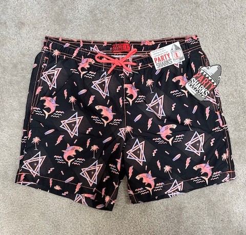 This item.... is BLACK, with orange/purple neon - in Size ADULT MEDIUM. It's a NEW "Party Sharks" brand Bathing Suit / Swim Trunks. (Called "Neon Sharks".) Quick-dry technology, mesh lining, rear pocket with adhesive velcro to keep closed. Available for nationwide bidding. Item can be shipped anywhere to Winning Bidder - or picked up for FREE in Enfield, CT after the Auction. Fun style, great fit!