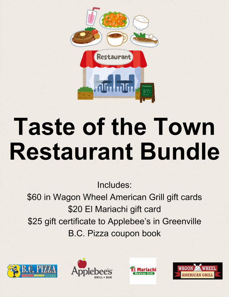 Donated by El Mariachi, Applebee's of Greenville, Wagon Wheel American Grill, and BC Pizza of Greenville