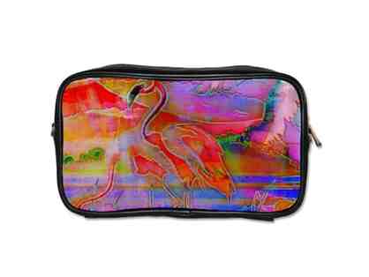 "PINK FLAMINGO": UNISEX LEATHER ESSENTIALS BAG W/ART INSET, DETACHABLE STRAP |