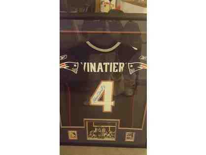 Adam Vinatieri Autographed Jersey, Framed, Super Bowl Picture, Two Cards