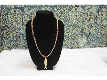 Two Necklaces: Wooden and Bone Beads, Bone Fish, Tibetan Prayer Beads