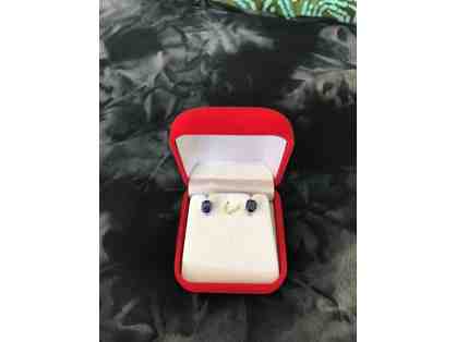 Pair of oval sapphire earrings set in sterling prong setting.