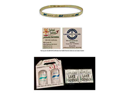 Lake Geneva Living Bracelet, (2) $50 Restaurant GCs, Stemless Wine Glass