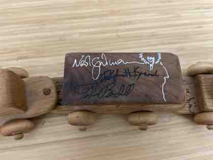 Wooden train autographed by 23 authors (including Neil Gaiman and Connie