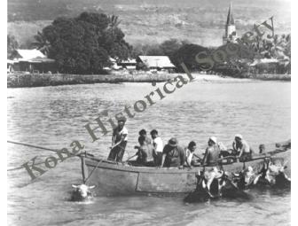 An historical photo of cattle shipping, circa 1920, with Kailua-Kona, Hawai`i and Mokuaikaua Church in the background.